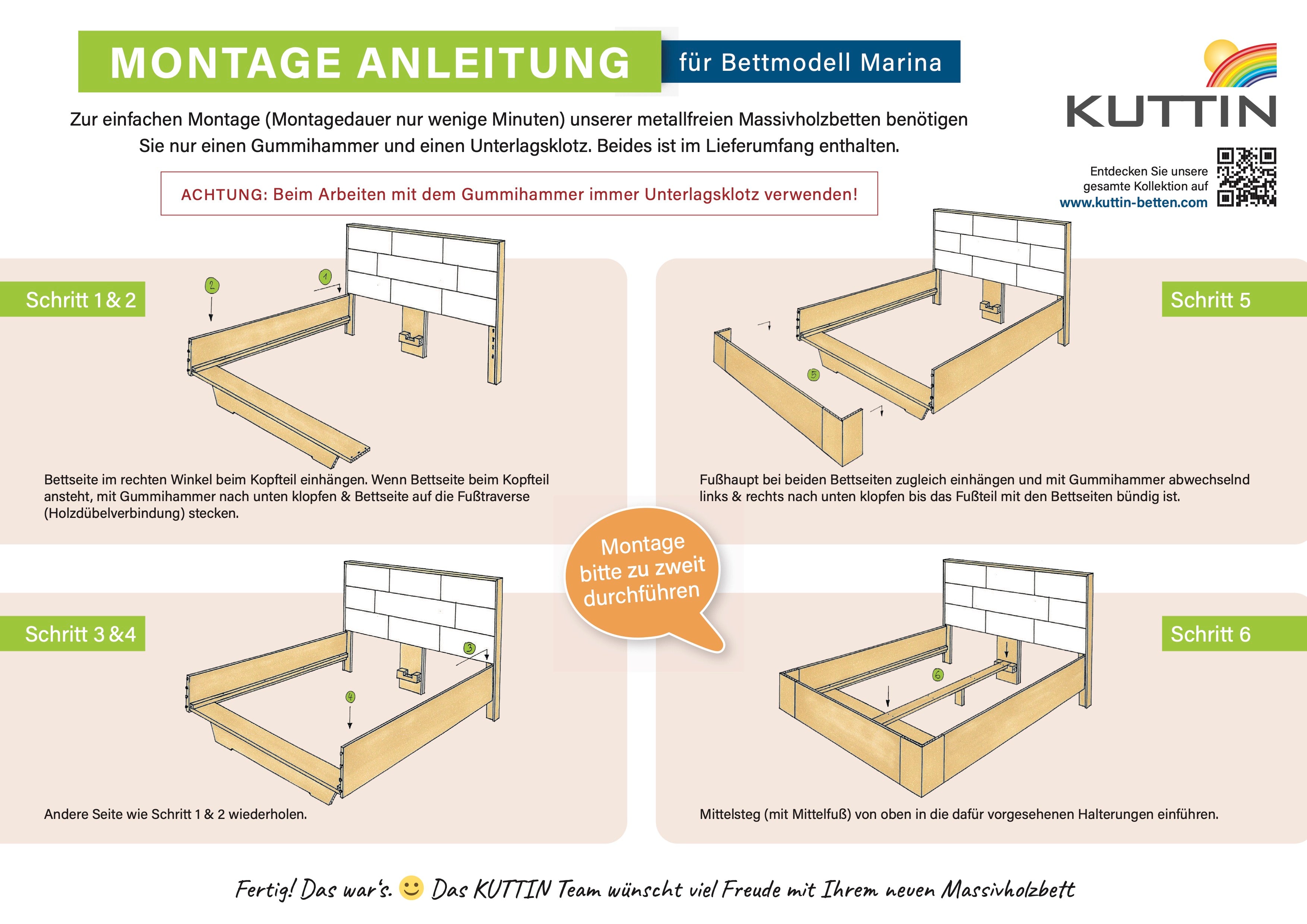 Zusammengefasst bedeutet dies, dass Sie Ihr Bett in Windeseile ohne besondere Werkzeuge etc. aufbauen können. Alles, was Sie benötigen (Gummihammer, Unterlagsklotz) wird mitgeliefert.